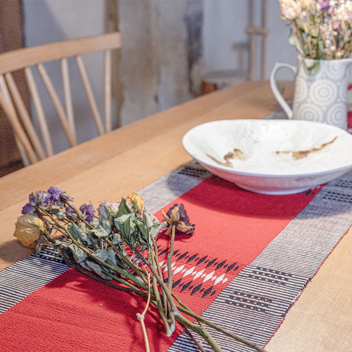 Skilfully woven on a traditional backstrap loom, this handwoven table runner features intricate black and white geometric diamond motifs with bold red as its primary colour. The edges are adorned with striped pattern woven in black and white further enhancing its visual appeal. This stunning piece is highlighted by its detailed braided weave and the twisted tassels at each end. Showcasing exceptional craftsmanship this runner is crafted by a collective of women weavers in the Phek region of Nagaland using the ancient handloom weaving technique, this piece is both durable and beautiful. Made from 100% cotton and processed with AZO-free dyes this piece is both durable and beautiful. Handloom textiles, with proper care, will last a very long time. Pair this table runner with our matching placemats and coasters. Perfect for festive setups.